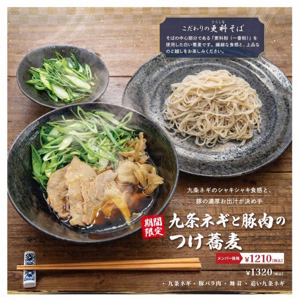さらに、九条ネギの爽やかな香りとシャキシャキ食感が際立つ「九条ネギと豚肉のつけ蕎麦」も魅力的。そばの中心部を使用した更科そばは、なめらかな喉ごしと上品な味わいが特長です。豚肉の旨みが溶け込んだコク深いつけ汁とともに味わうことで、素材の魅力が引き立つ一品に仕上げました。春にぴったりの和の贅沢をお楽しみください。